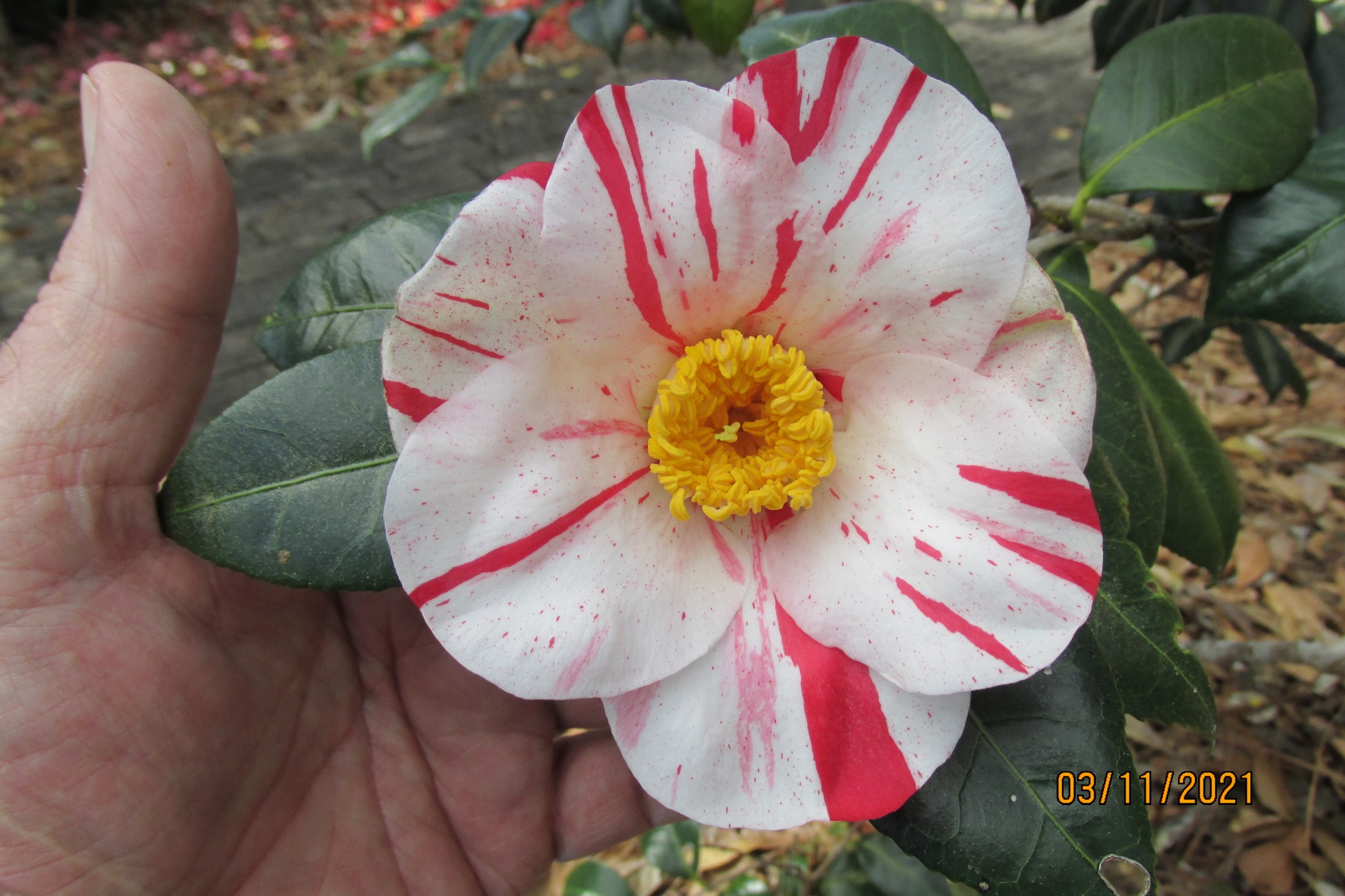 SCCS Camellia Nomenclature 2009, p.100; Medium size rose form double. White, striped red and blotched white.Average upright growth. Flowers mid-season to late. Originated in 2008 by CamelliaShop, Savannah, Ga., USA. |