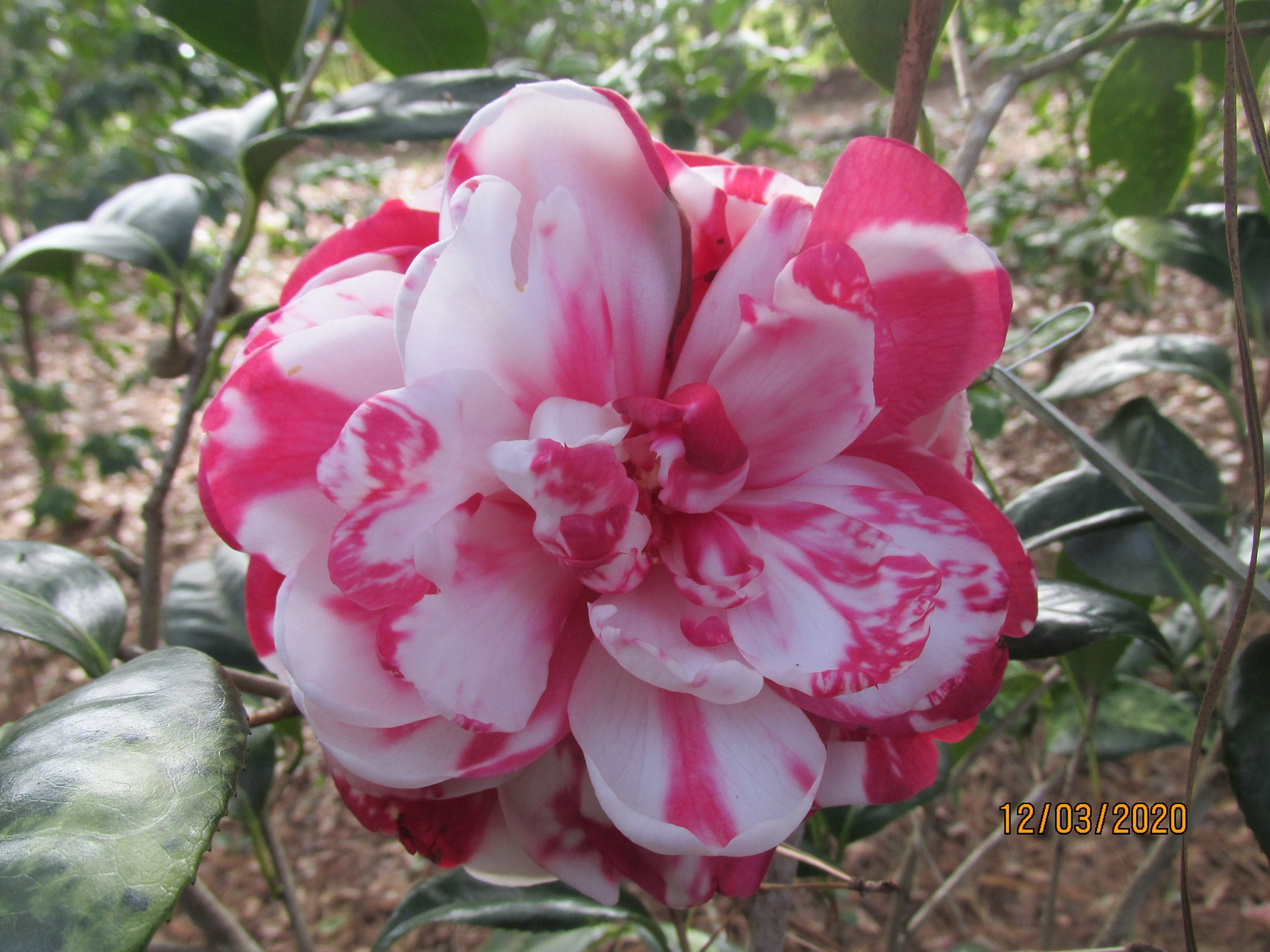 Nuccio’s Nurseries Catalogue, 1960: Bright red and white, large size, formal double. Vigorous, upright growth. Early to mid-season blooming. Originated by Mrs A. Wood, San Gabriel, California, USA.
