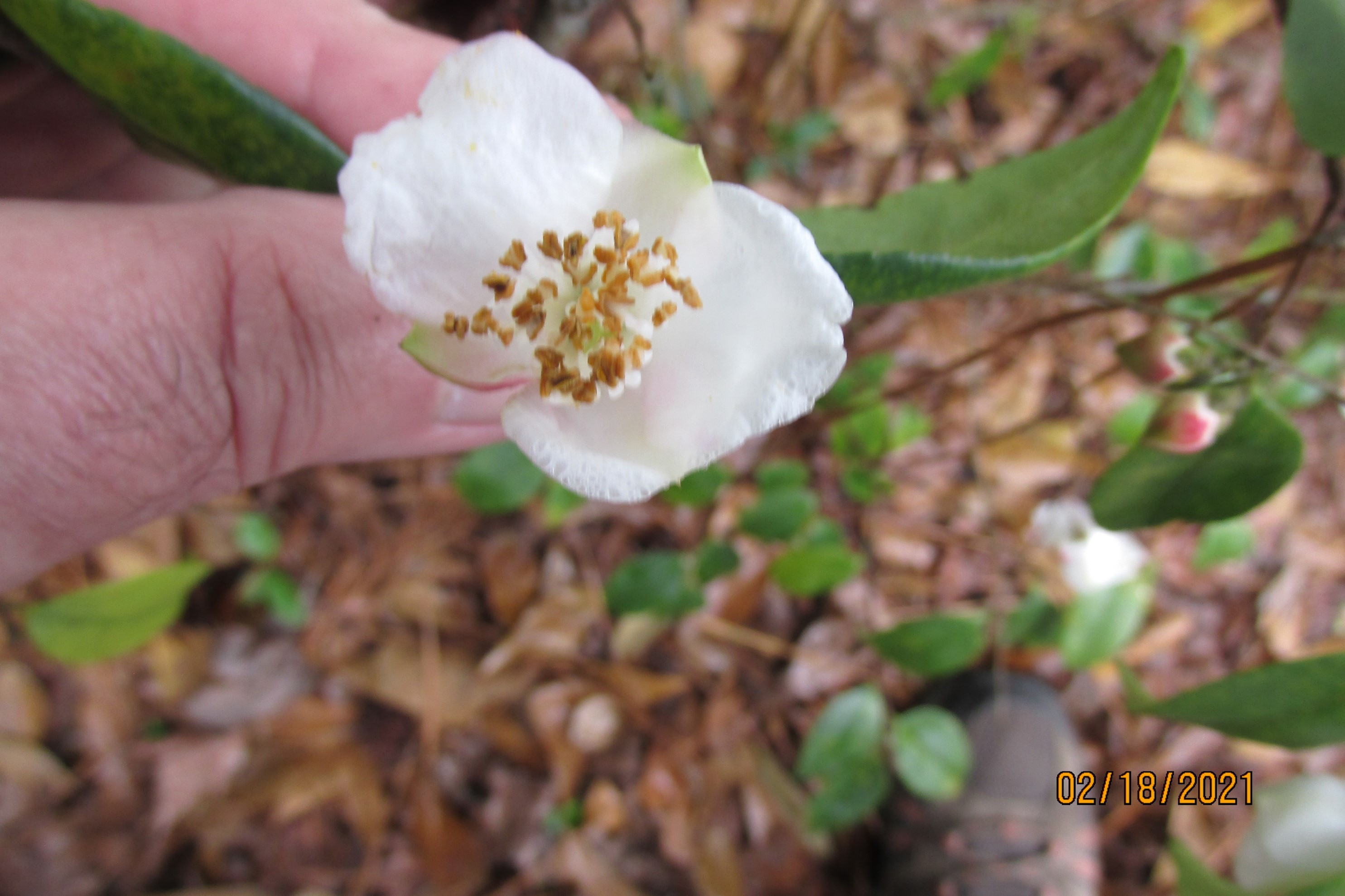 Species: Camellia cuspidata Color: White with golden anthers and yellow filaments Form: Single Size: Miniature Bloom Season: L Leaf Characteristics: Leaves pointed and narrow-elliptic - 2 1/2" x 3/4", leathery Place of Origination: Southern China |