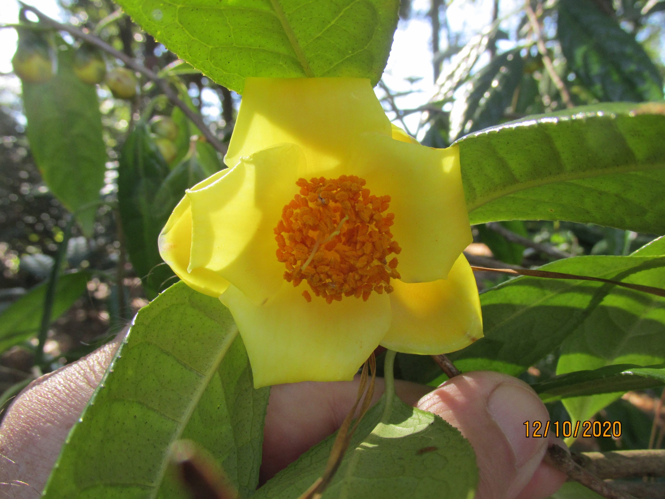 Species: Camellia nitidissima Color: Golden yellow with shiny, heavy textured petals Form: Single to semidouble Size: Small Bloom Season: M Growth Rate: Vigorous Growth Characteristics: Upright, open growth Leaf Characteristics: With very large, heavily ribbed, distinctive foliage Place of Origination: Southwest China and Northern Vietnam Other Information: Formerly called Camellia chrysantha