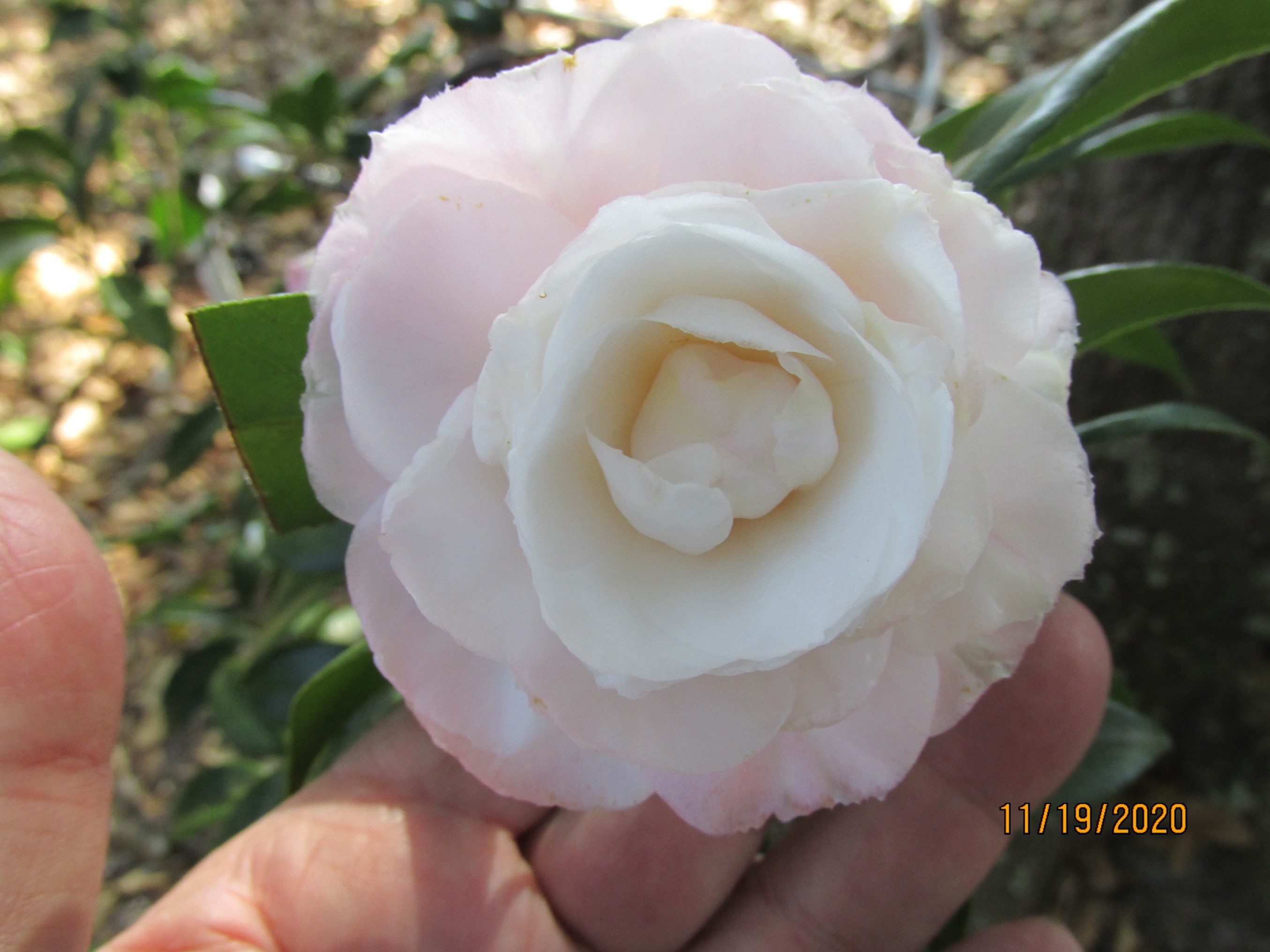 Nuccio’s Nurseries Catalogue, 1978, p.12: (N #730l): Medium semi-double with pointed petals. Blush white with both centre and outside petals toned a deeper pink. Blooms mid-season to late. American Camellia Yearbook, 1979, p.110, Reg. No.1529: A medium, blush white centre and outside petals toned deeper pink, formal double with pointed petals. C.japonica chance seedling; originated by Nuccio’s Nurseries, Altadena, California, USA. The 5 year old seedling first bloomed 1973. Average flower size, 8 cm across. Plant growth is upright, dense and medium with dark green leaves, 6 cm long x 3.8 cm wide. For colour photos see p.108, Macoboy, 1981, The Colour Dictionary of Camellias, and the front cover, SCCS., 1977, The Camellia Review, vol.39, No.l. Chinese synonym: ‘Niuxiao Zhenzhu’. This cultivar was awarded as an AGM (Award of Garden Merit) plant by the Royal Horticultural Society in 2012 at H5 rate (hardy: cold winter; -15°C to -10°C).