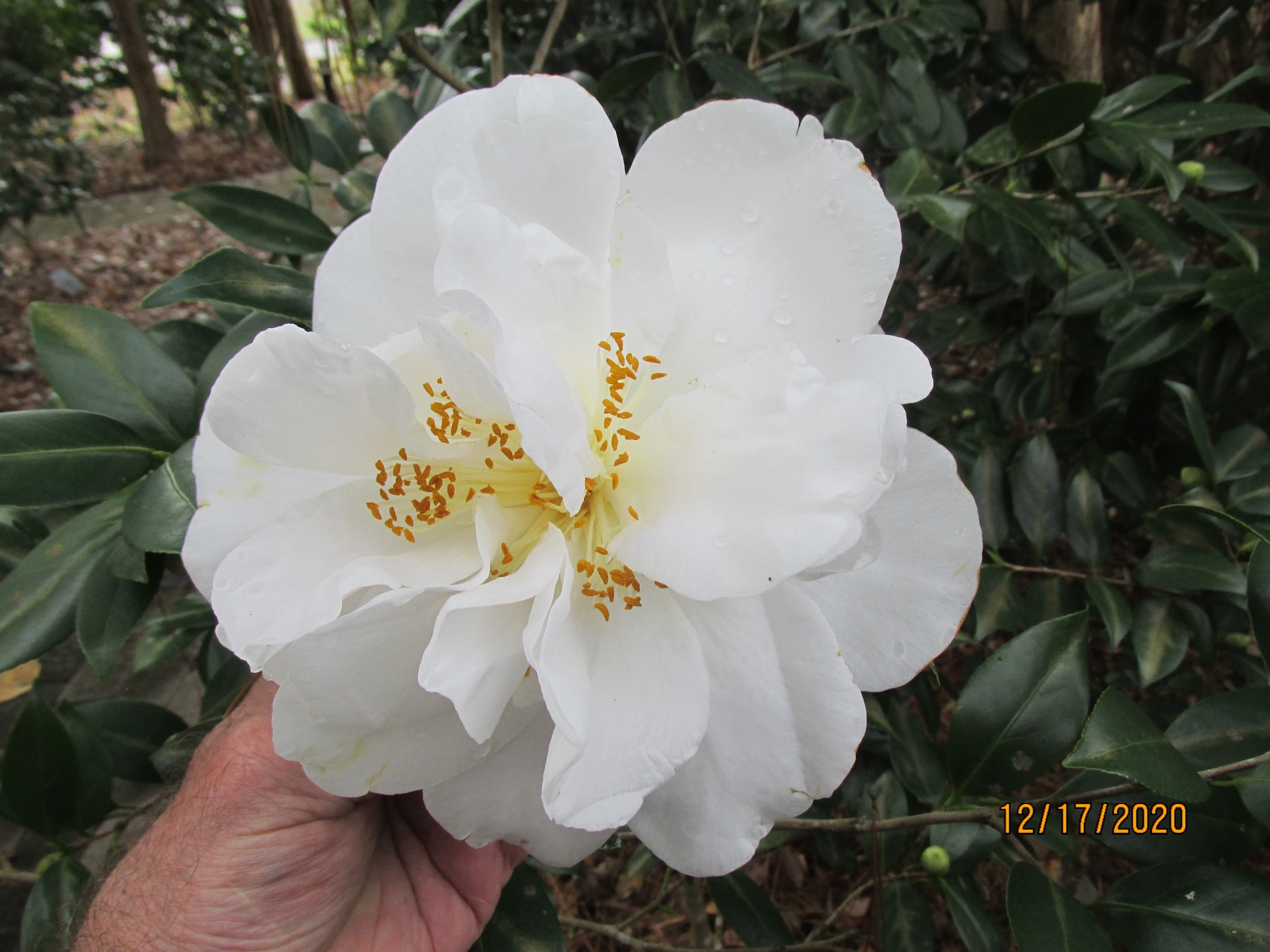 ‘Frizzle White’ type, flower is 15 cm across x 10 cm deep with 35 petals