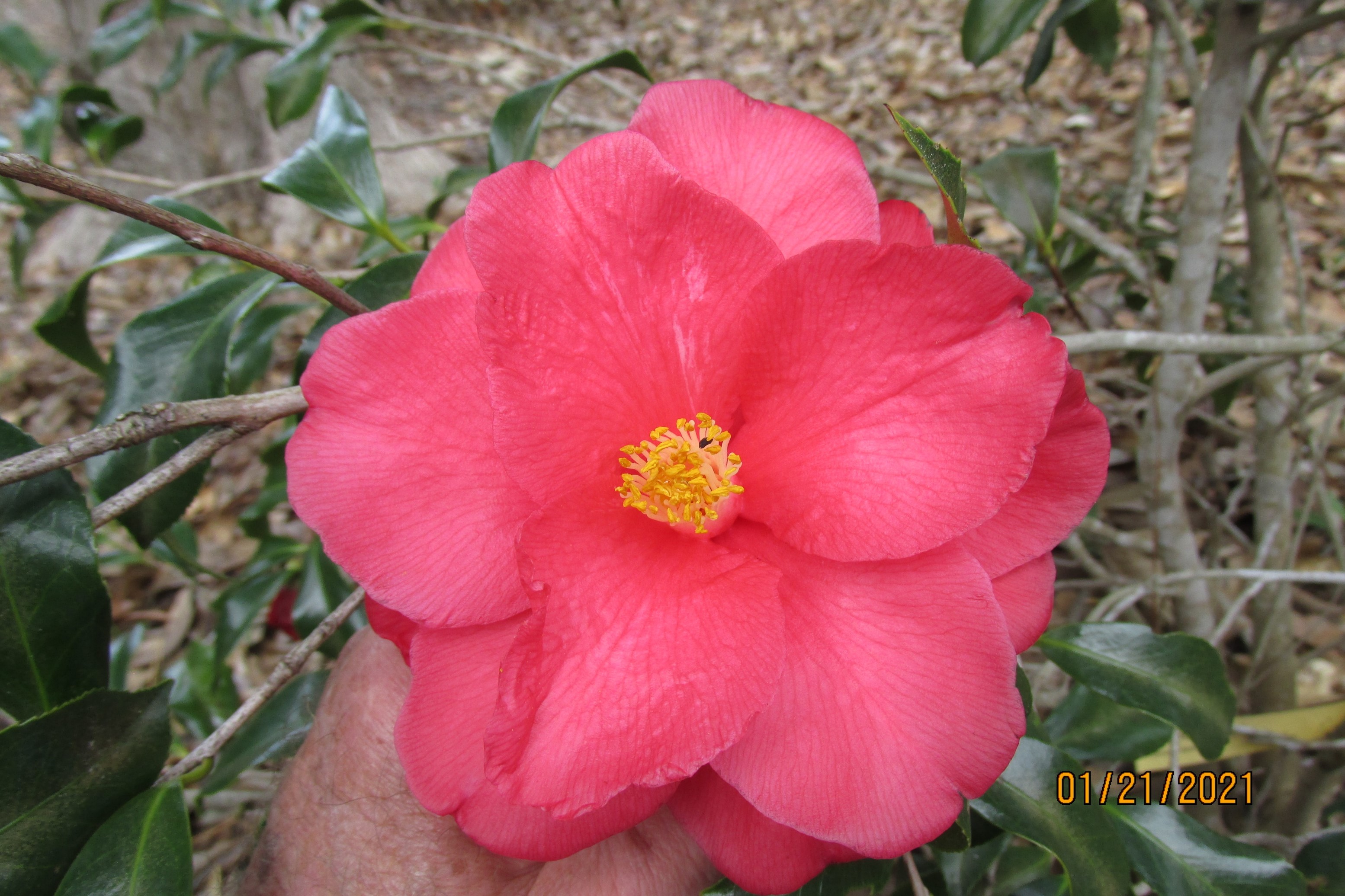 Tammia Nursery Catalogue, 1859: Bright red. Large, semi-double with fluted petals. Vigorous, upright growth. Early bloomimg. Originated by V. Howell, Pelahatchie, Mississippi, USA. Sport: Christmas Beauty Variegated. Abbreviation: ‘Christmas’. |