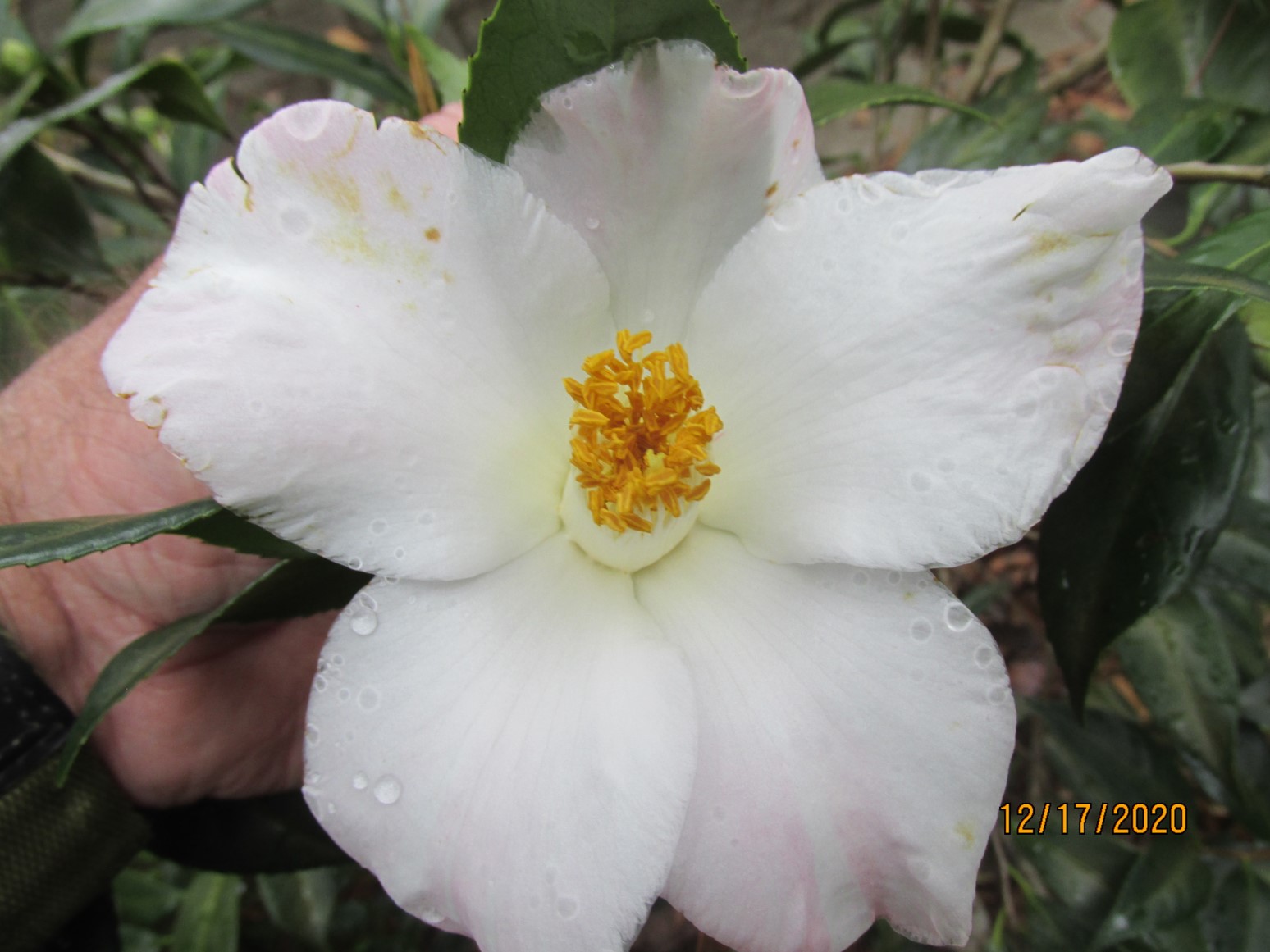 Cilie Sutton. (C.japonica), SCCS Camellia Nomenclature 2009, p.31; White with pink tinges at the petal edges. Medium size single. Vigorous, upright, spreading growth. Flowers mid-season. Rebel Yell x Omega. Raised by CamelliaShop, Savannah, Ga, USA, in 2008. |