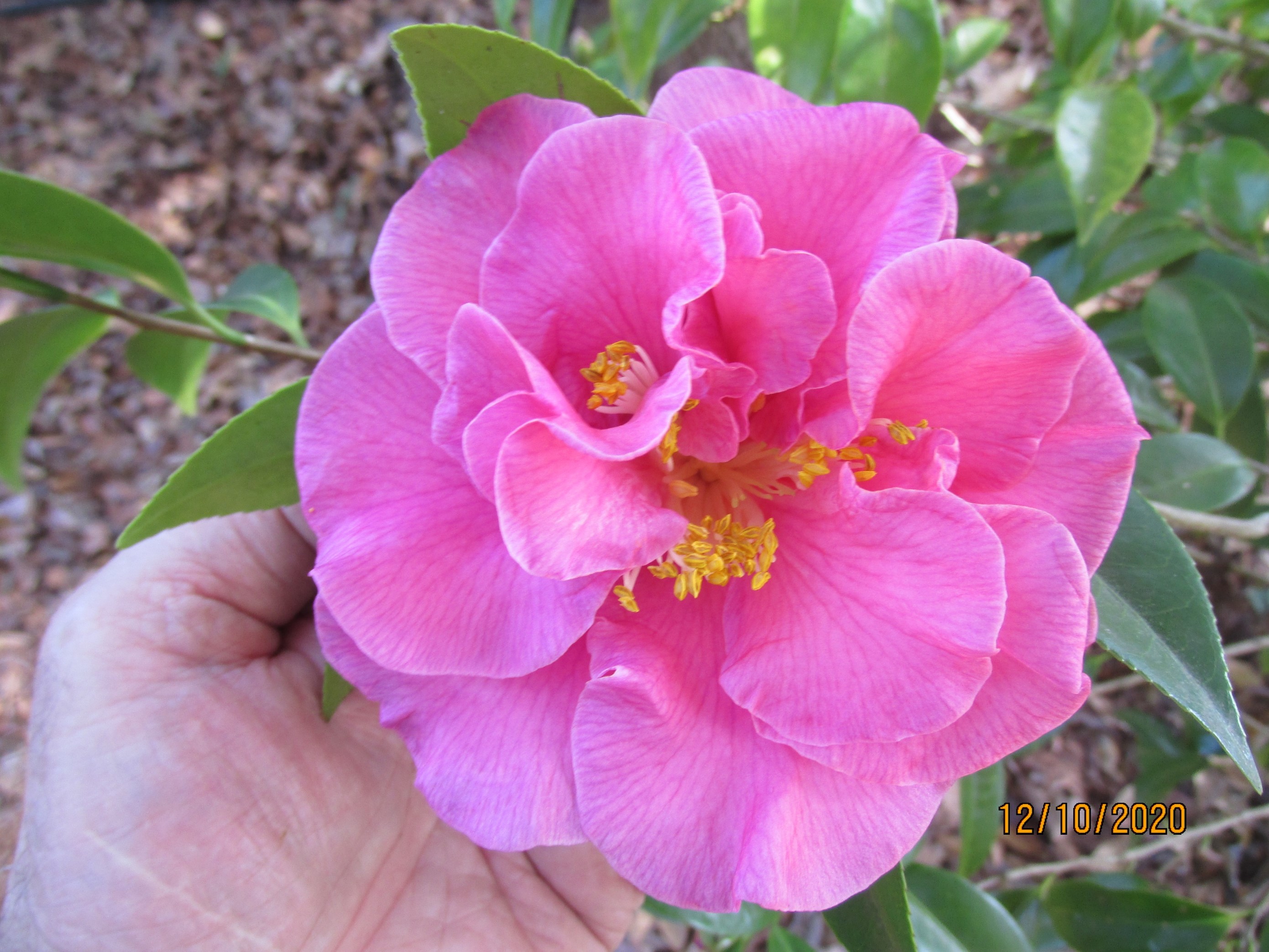 American Camellia Yearbook, 1977, p.211, Reg. No.1425: A large, light, roseĀpink semi-double. A 6 year old chance C.japonica seedling that first bloomed 1975. Originated by Paul Gilley, Grandridge, Florida, USA. The Frizzle White type, bloom has 20 plus petals and 4-12 petaloids with cream anthers and yellow filaments. Average size is 11 cm across x 5 cm deep. Blooms early to mid-season. Plant growth is upright and rapid with light green leaves, 9 cm long x 5 cm wide. |