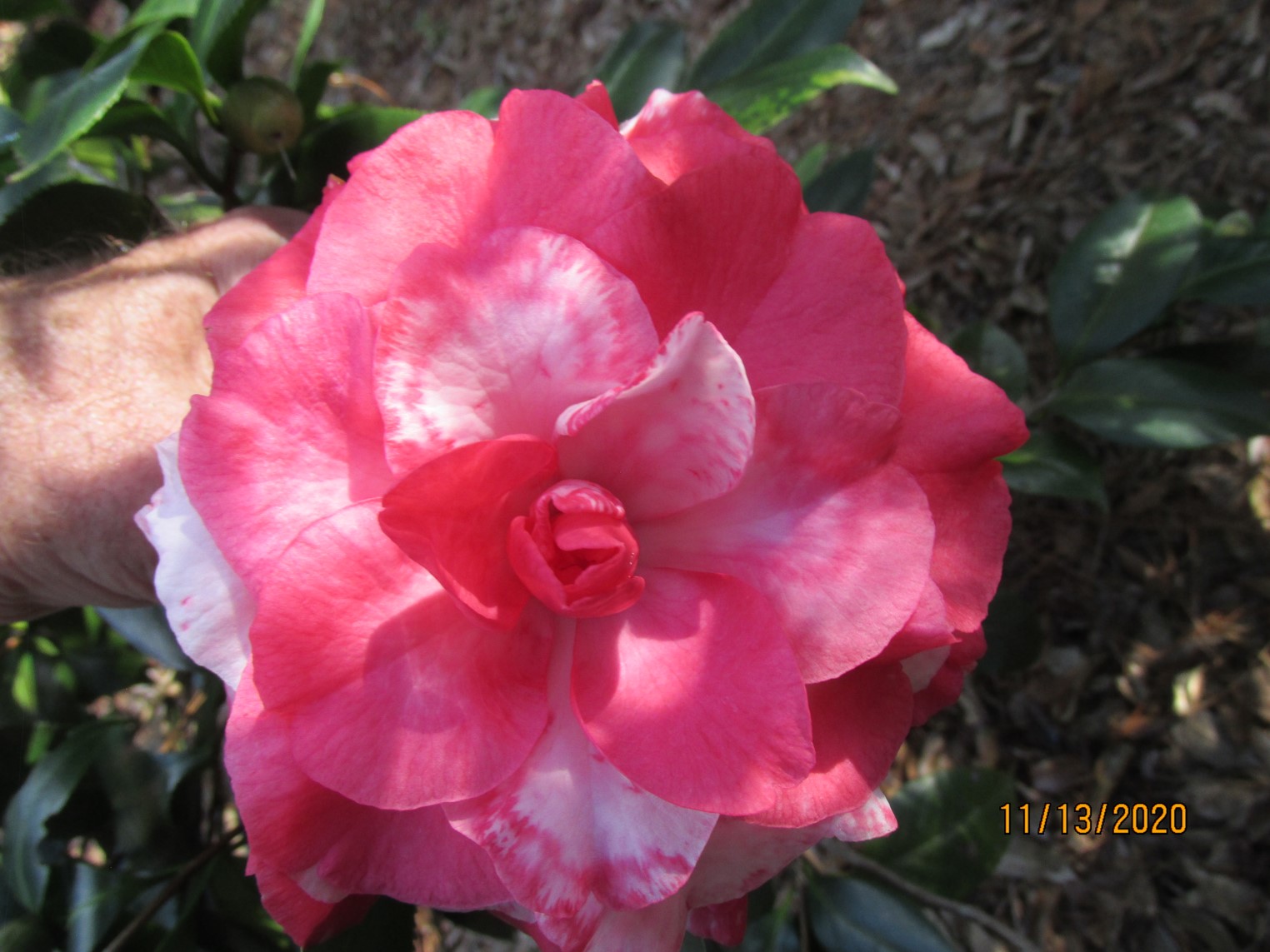 double flower has rose-red splotches and white moiré, 36 petals, heavy
