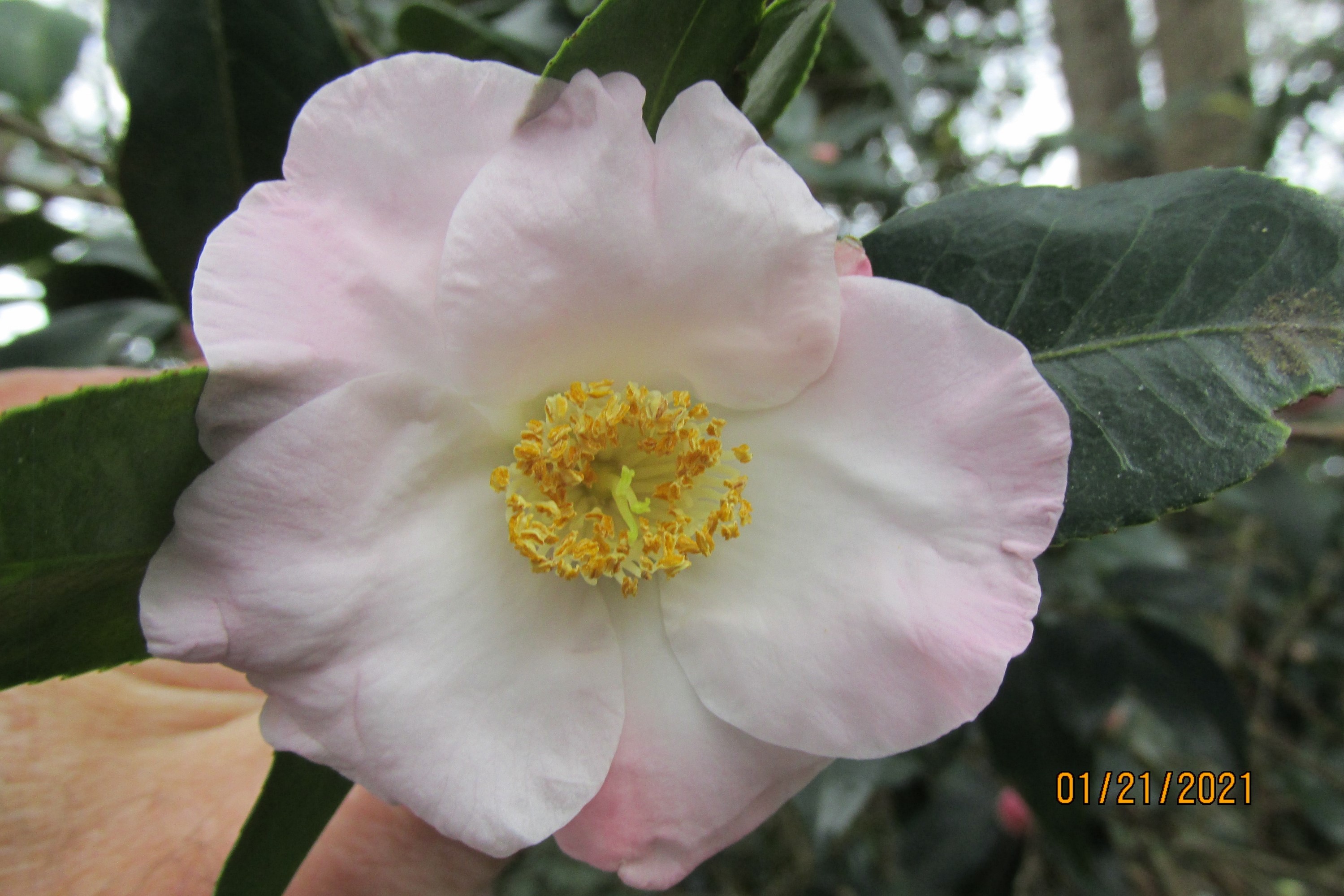 Camellia Forest Nursery Catalogue, 1988, p.2: A seedling of C.japonica Berenice Boddy x (C.saluenensis x C.rosiflora). Small, white flowers with pink edges, in such profusion as to resemble a Japanese cherry in full bloom. Foliage delicate and small but growth rate rapid. ACS., Reg. No.2205; p.18, The Camellia Journal, vol.46, No.2, May 1991. Originated in USA. Chinese synonym ‘Huanxiang’ |