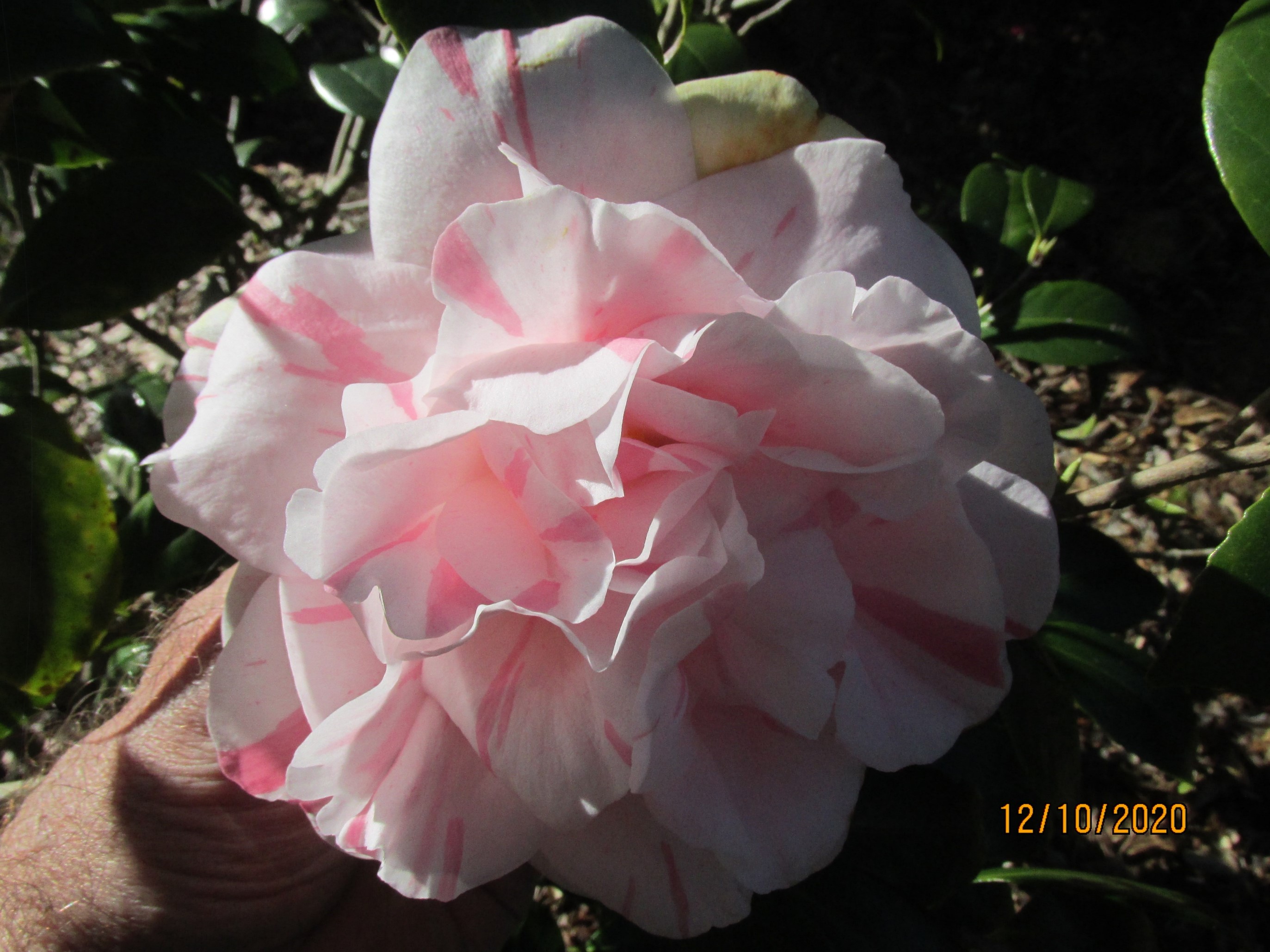 American Camellia Yearbook, 1973, p.192, Reg. No.1231: An 8 year old chance japonica seedling that first bloomed 1968. Originated by R.V. Burgess, Savannah, Georgia, USA. Plant growth is spreading and rapid in rate with light green leaves, 10 cm x 5.5 cm. The peony form Debutante type, bloom is striped deep pink with rose splotches. It has 18 petals and a group of petaloids and yellow anthers. It measures 13 cm across x 7.5 cm deep. Mid-season blooming. |