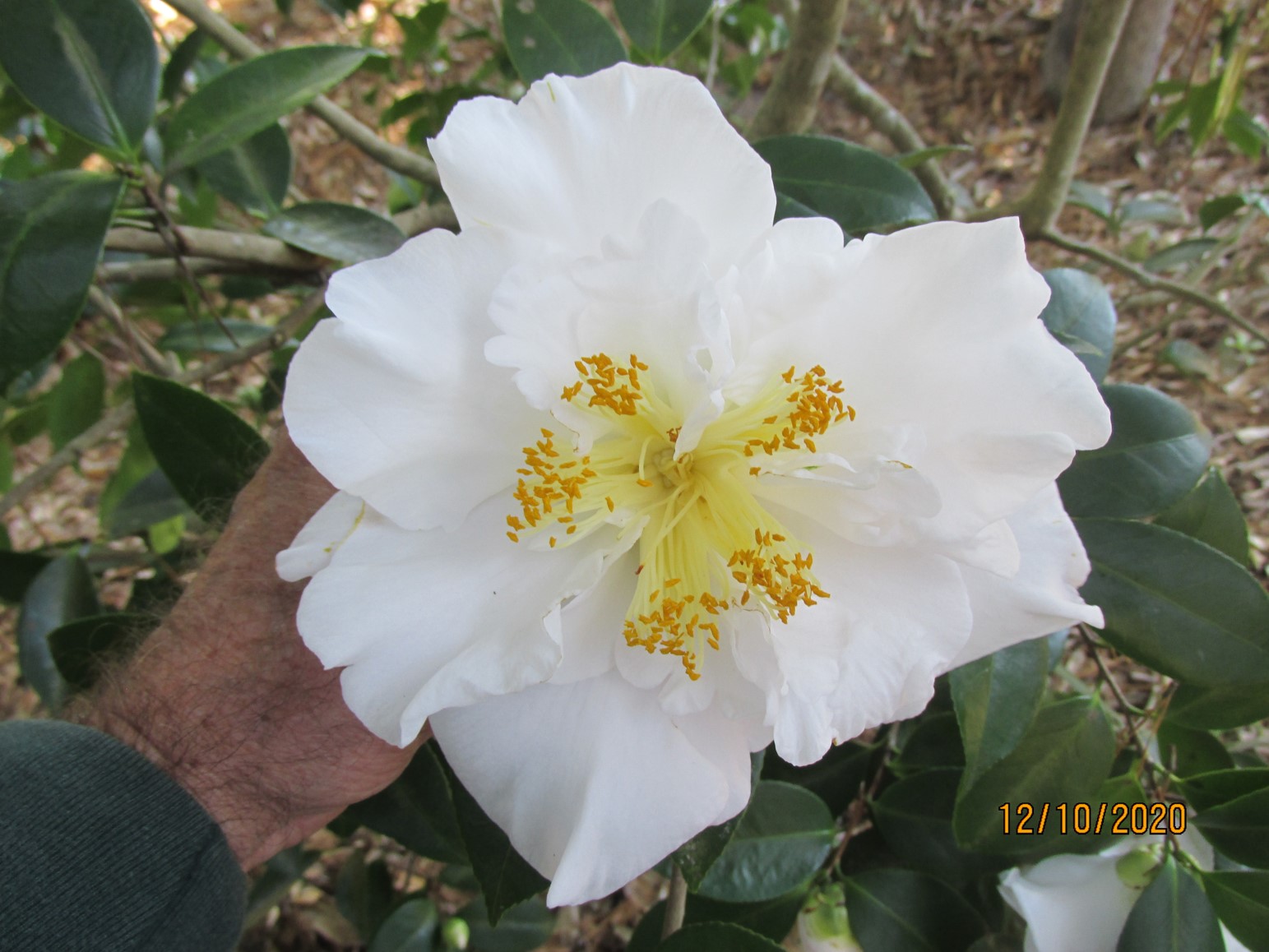 ACS, The Camellia Journal, Nov. 2000, p.39, colour photo p.38, Reg. No.2536. A semi-double white to blush pink flower with golden anthers and cream filaments. Originated by Harriet Harms, Savannah, Ga., USA. American Camellia Yearbook, 2000, p.3, colour photo p.c10. The 39 year old seedling first flowered in 1967. Flowers early. Average flower size is 13.5 cm across x 5.7 cm deep, with 16 petals. Inner petals are crinkled, notched and folded. Plant growth is upright and average, with dark green leaves 10 cm long x 5 cm wide.