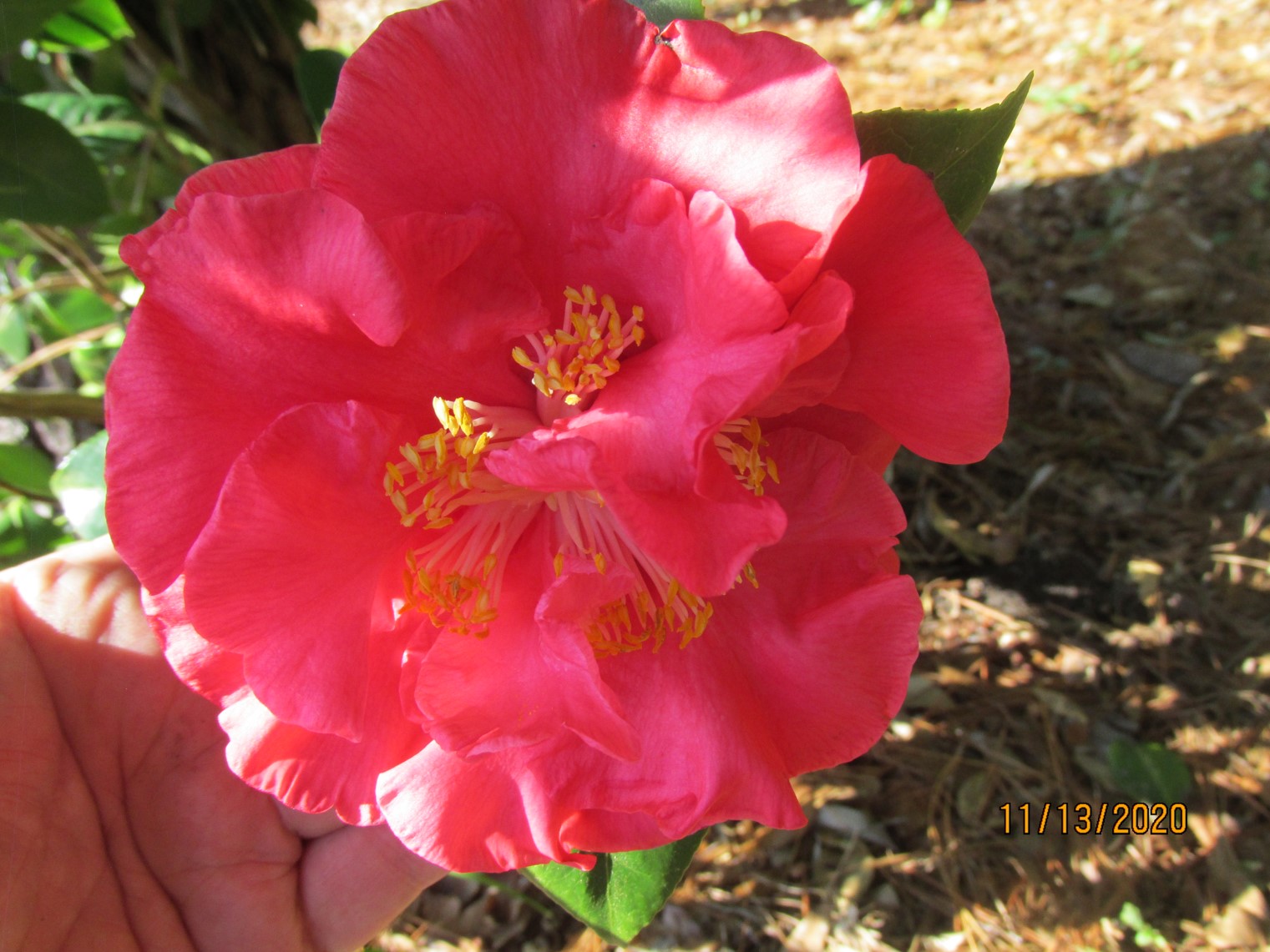 red, with orange cast, semi-double. A 7 year old chance japonica